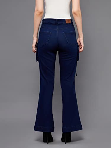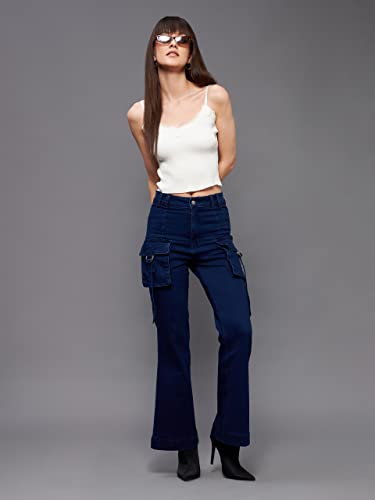Miss Chase Women's Wide Leg High Rise Clean Look Regular Length Stretchable Denim Cargo Jeans